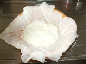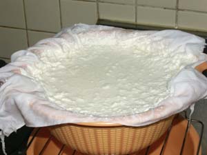 ・2〜3時間絞ります。 ・その後タッパなどの容器に入れてさらに絞ります。 ・一晩くらい重石をすると丸いチーズができます。 ・重さはチーズの固まり具合により加減します。 |
