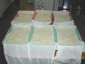 ・バットにさらし布を引き薄く盛ります。 ・さらにさらし布をかけ、霧吹きでぬらします。 |