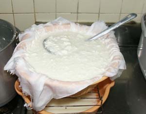 ・2〜3時間絞ります。 ・その後タッパなどの容器に入れてさらに絞ります。 ・一晩くらい重石をすると丸いチーズができます。 ・重さはチーズの固まり具合により加減します。 |