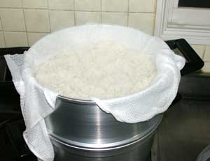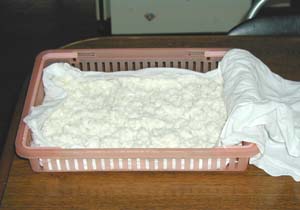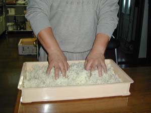 ・バットにさらし布を引き薄く盛ります。 ・さらにさらし布をかけ、霧吹きでぬらします。 |