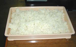 ・米を洗って、一晩水に浸けます。 ・次の日ざるに上げ、15分くらいおき、水を切ります。 ・1時間ほど蒸すと左の写真のようになります。 |