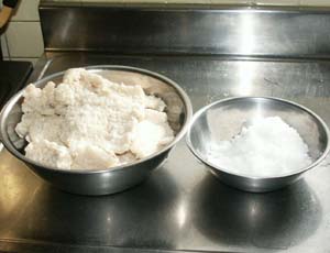 ・左は生米麹で、乾燥麹の約1.2倍の量になります。 ・分量の塩を用意します。 |